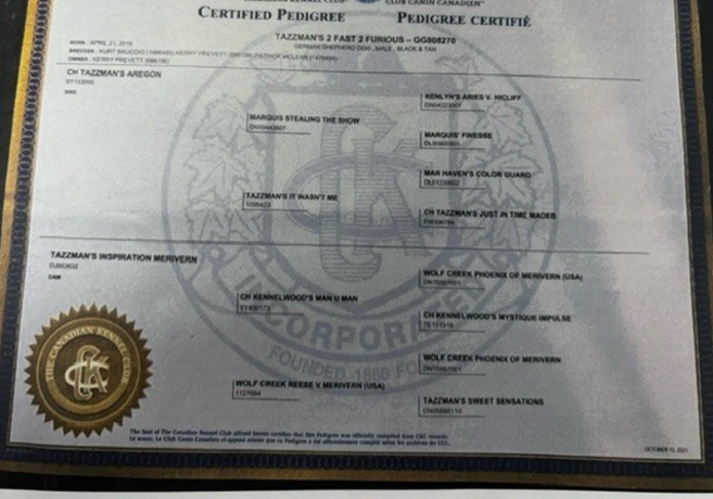 MV can/Am ch Tazzman's 2 Fast 2 Furious - "Torretto" He is OFA Hips and Elbows clear. Torretto is a loving, affectionate boy and protective of his family. Torretto loves and greets everyone with a smile and happy tail. He helps kids with disabilities making them feel safe and comfortable near him when they visit. Torretto does great in the ring and has many accomplishments, presently he is # 1 German shepherd dog in conformation in Canada and #2 German Shepherd Dog in Conformation in USA